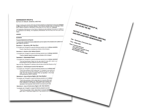 The 2019 Annual Report, Notice of Meeting and Proxy Form, and the proposed replacement IGO Constitution can be viewed by clicking the links below.